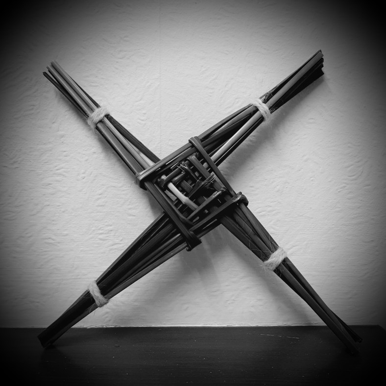 The beginning of February has been a popular time for festivals. In the Christian era in Ireland, the date became associated with St Bridget (Brigid, Bride, Brighde, etc), second only to St Patrick as the country’s principal saint. She in turn was conflated with the great pagan goddess of the same name. St Bridget was invoked by metalworkers, in healing, and in warfare, as well as in connection with fire and thunderstorms. By the 18th century it was believed that Bridget would visit the homes of the virtuous on the night before her feast, and bless the inhabitants. In some places, offerings of food – cakes or bread – would be left on window sills for her, but more usually a cross would be woven out of rushes or straw, and hung near a door or window to welcome her. This custom has been widely adopted well beyond Ireland, and is popular in the neo-pagan community as a way of marking Imbolc. There are even tutorials on YouTube to teach you how to make a St Bridget’s cross. I made mine yesterday, although as I didn’t have any rushes or straw to hand I raided the garden and used the dried stems of a large ornamental grass instead. Traditionally, the crosses are left up all year, the old cross being burned when the new one is made.