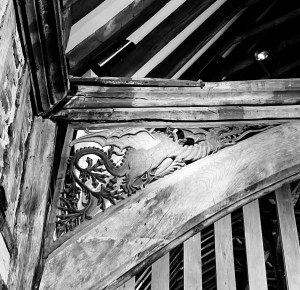 We were upstairs in the Great Hall, where the one remaining carved dragon (there were 14 originally) has been rescued from under a pile of rubbish in an outbuilding, restored, and put back where it belongs in the beams of the splendid roof. Another treat was the remnants of Victorian wallpaper, which Florence pointed out. It’s lovely that NCW are so evidently proud of the building, and great to see that it’s in daily use and living again.