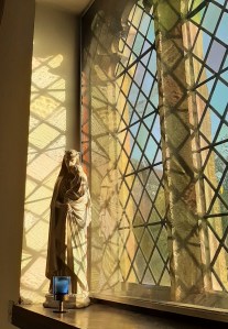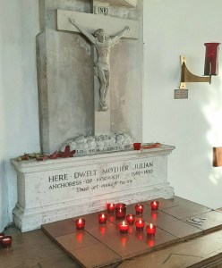 At lunchtime I went exploring. The Church of St Julian is literally across the road from Dragon Hall, and I had intended visiting many times when in Norwich but never quite got around to it because it’s a little way from the city centre. This is the place where the woman known as Mother Julian or Julian of Norwich lived as an anchoress (a hermit attached to a church) during the late 14th and early 15th centuries. Her cell has not survived, but a chapel has been built on the presumed location, on the south side of St Julian’s Church, and there is a shrine to her there, as well as an information centre just up the hill from the church. Julian (note – the name we know her by is the name of the church she was attached to; we don’t actually know what she was called) wrote the earliest surviving book in English by a woman, the Revelations of Divine Love. This work was the result of a mystical experience when she was seriously ill and near death, and was revolutionary in its emphasis on God as ever-loving (not a concept the medieval church embraced). It survived though convoluted channels of transmission in the UK and Europe, mostly treasured by nuns, and in the 20th century became a classic text of Christian spirituality. Perhaps the most-quoted line is “All shall be well, and all shall be well, and all manner of things shall be well.”